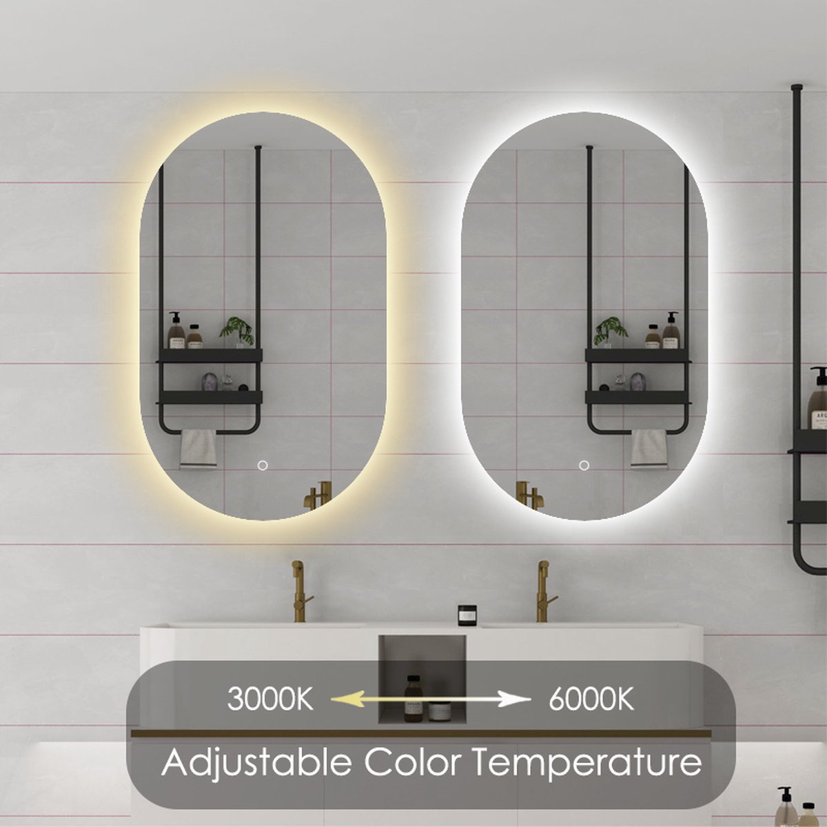 De LED-verlichting, slim geplaatst achter de spiegel, zorgt voor een prachtig lichteffect dat uw badkamer doet denken aan een vijfsterrenhotel. Met drie verschillende standen – 3000k(warm wit), 4000k(natuurlijk wit) en 6000K(koud wit) – kunt u kiezen voor sfeervolle, neutrale of functionele verlichting. Plus, de dimfunctie biedt nog meer aanpassingsmogelijkheden. Zo kan je de verlichting dimmen of feller zetten.