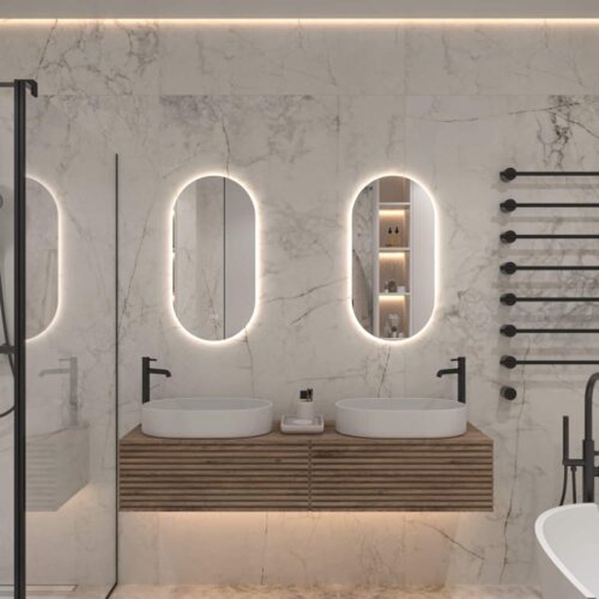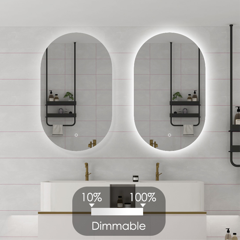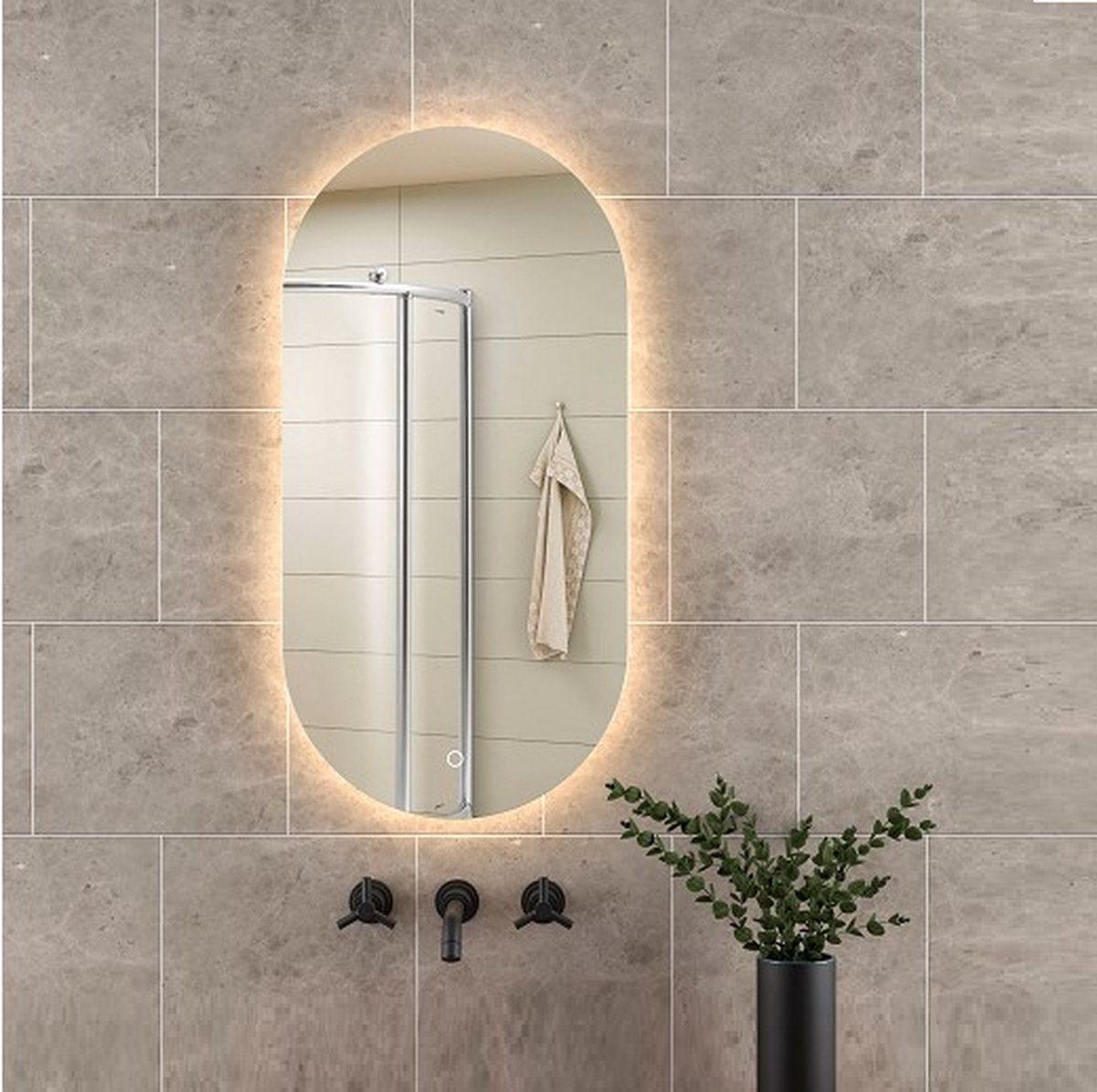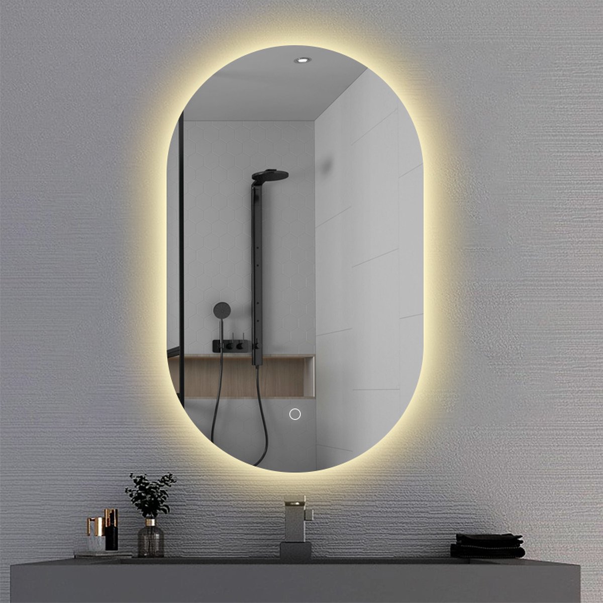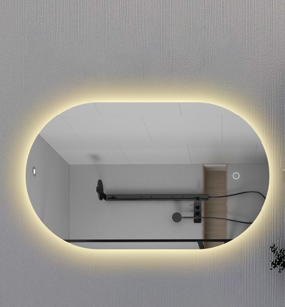 Badkamer Spiegel Ovaal is een luxe badkamerspiegel met een ingebouwde verwarmingselement en verlichting. Dit betekent dat je nooit meer last van condens hebt. De LED verlichting is instelbaar in 3 kleuren en daarnaast ook nog eens te dimmen of feller te maken door een eenvoudige handeling op de touchbediening, welke elegant is verwerkt in het spiegelglas.